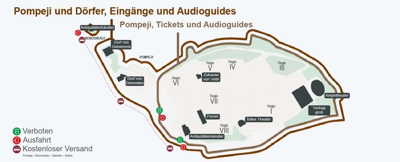 - Tickets für Pompeji und seine Villen (Villa der Mysterien, Villa des Diomedes, Villa Regina in Boscoreale) - Offizieller Ticketpreis: 25€; Der restliche Betrag entspricht zusätzlichen Dienstleistungen, Audioguides und Reservierungsservices